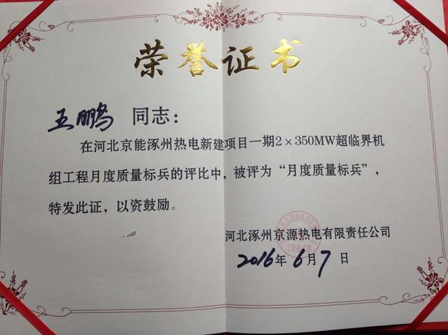 涿州项目部王鹏同志获得业主“月度质量����� �������Ƴ������������ �������Ƴ������������ �������Ƴ������������ �������Ƴ�������标兵”称号表彰